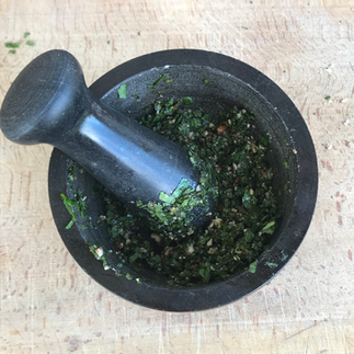 In a mortar, add the greens, the nuts and a couple of tbsp olive oil. Grind the mix together for several minutes. You can also use an electric mixer instead of a mortar, but I like the rustic texture of hand ground pesto.